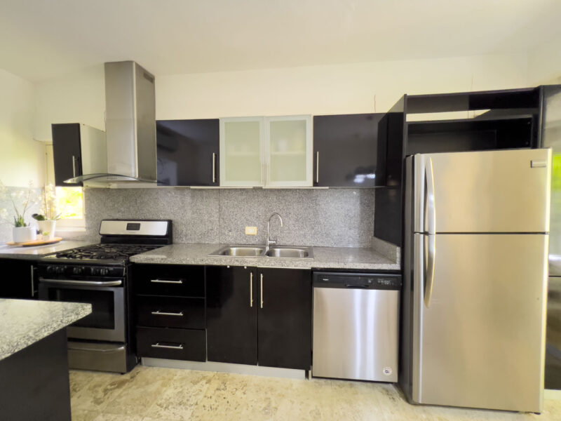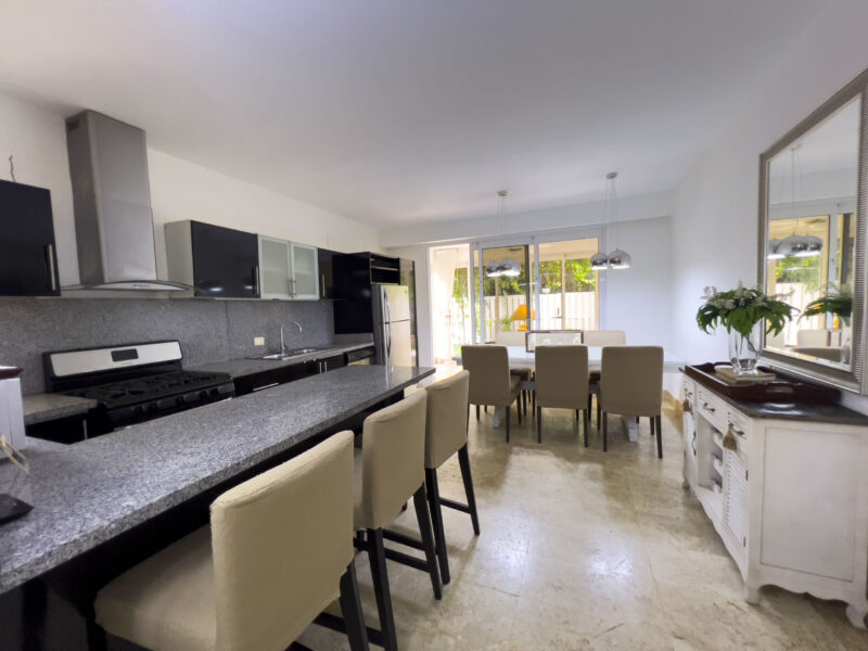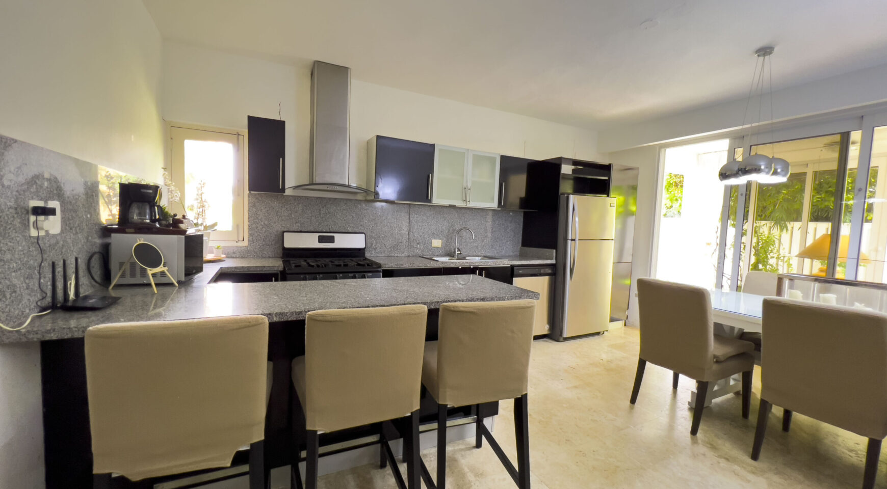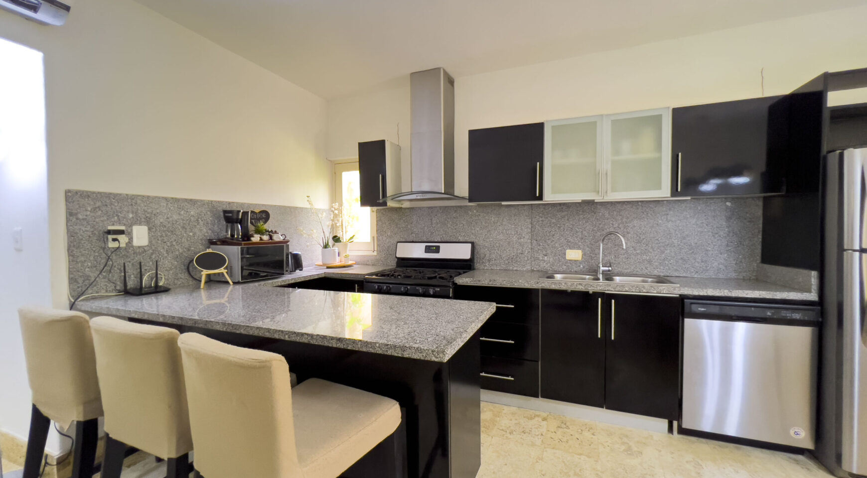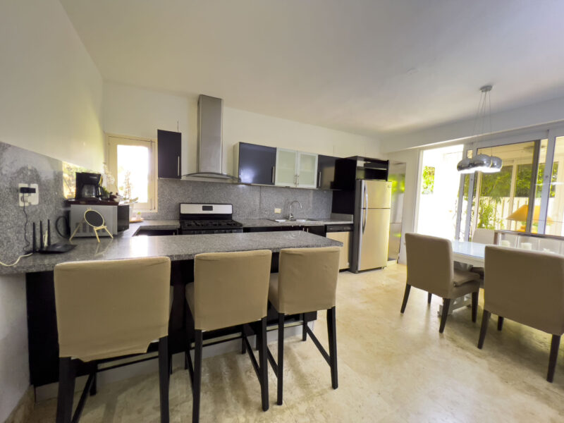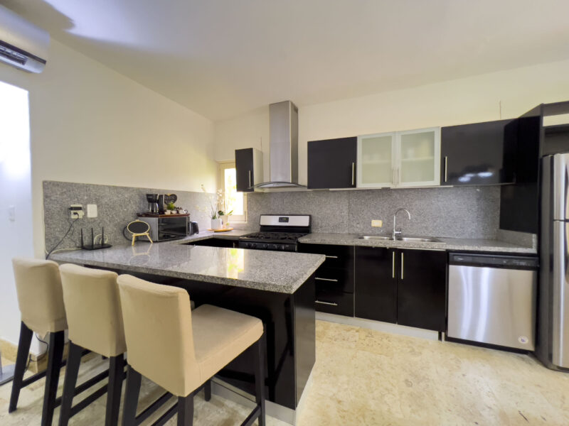• Cocina moderna con amplio desayunador en granito y línea blanca.