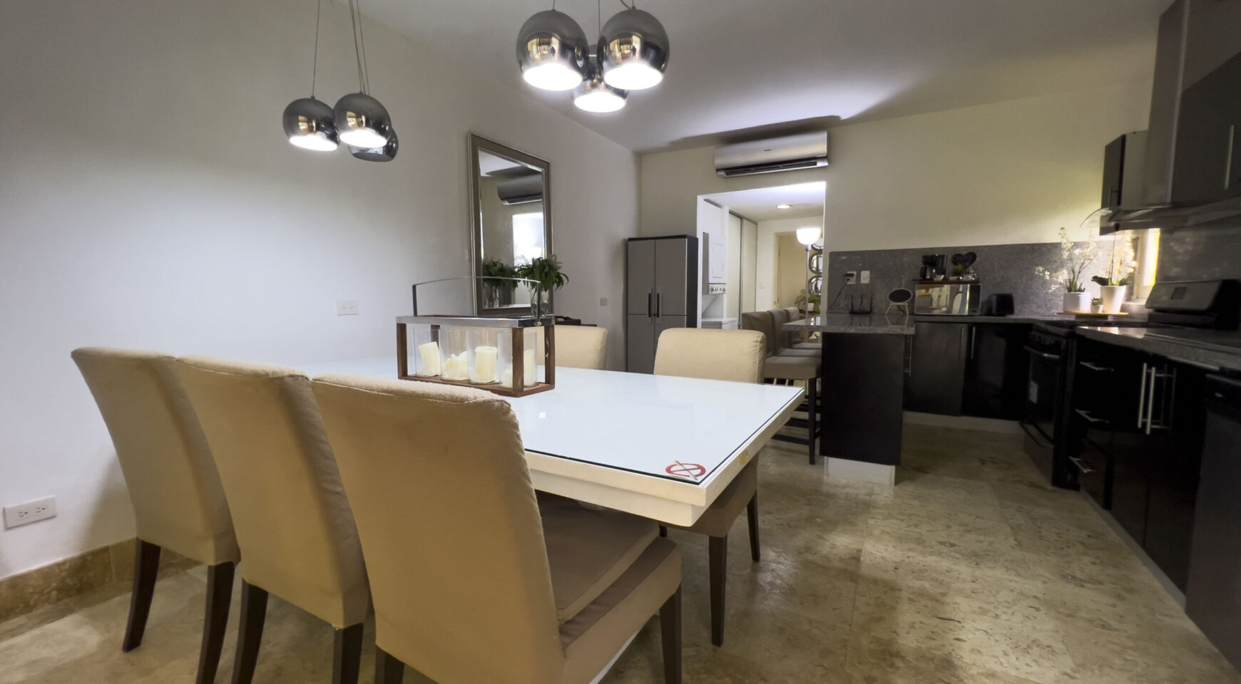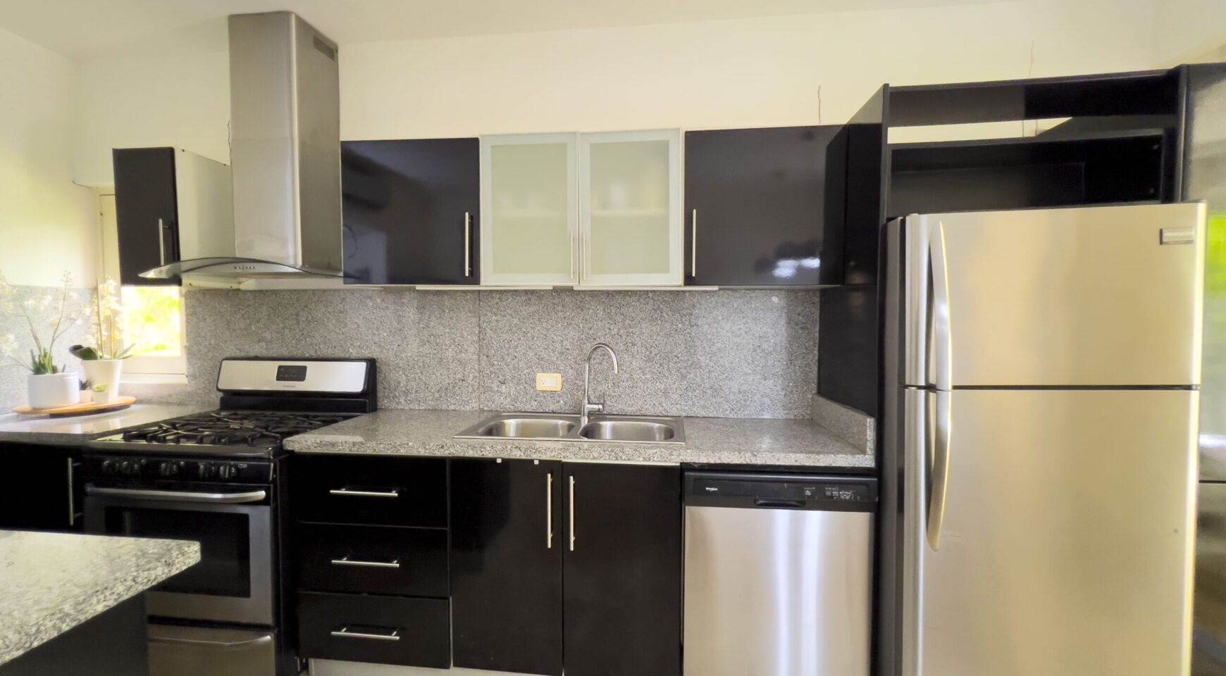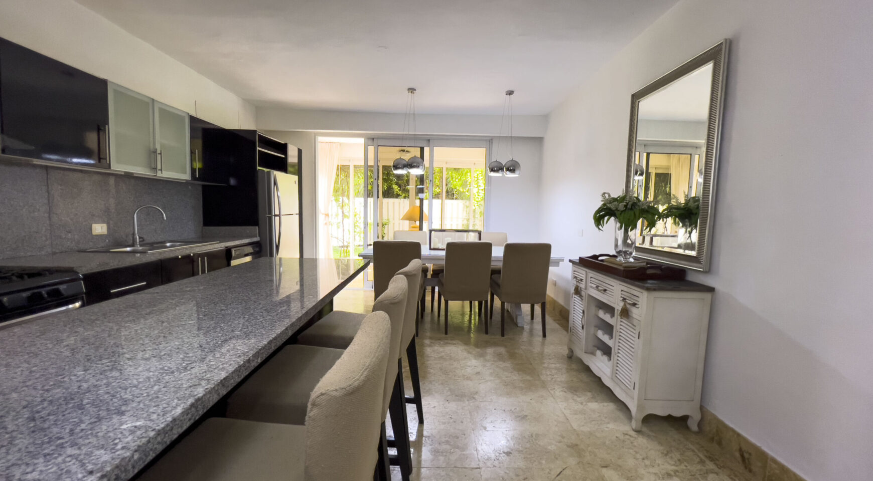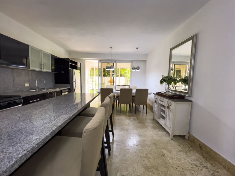 • Cocina moderna con amplio desayunador en granito y línea blanca.