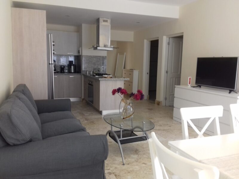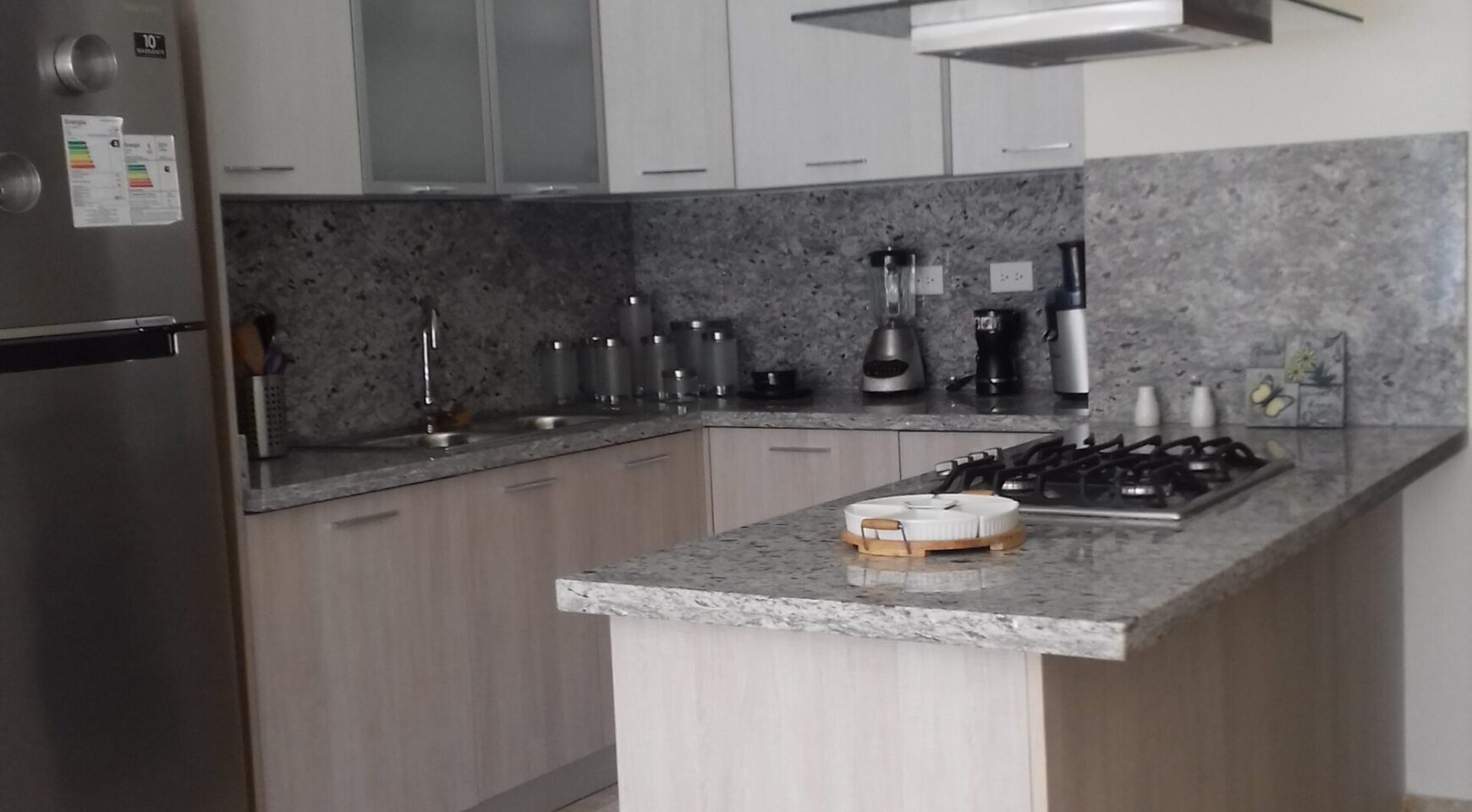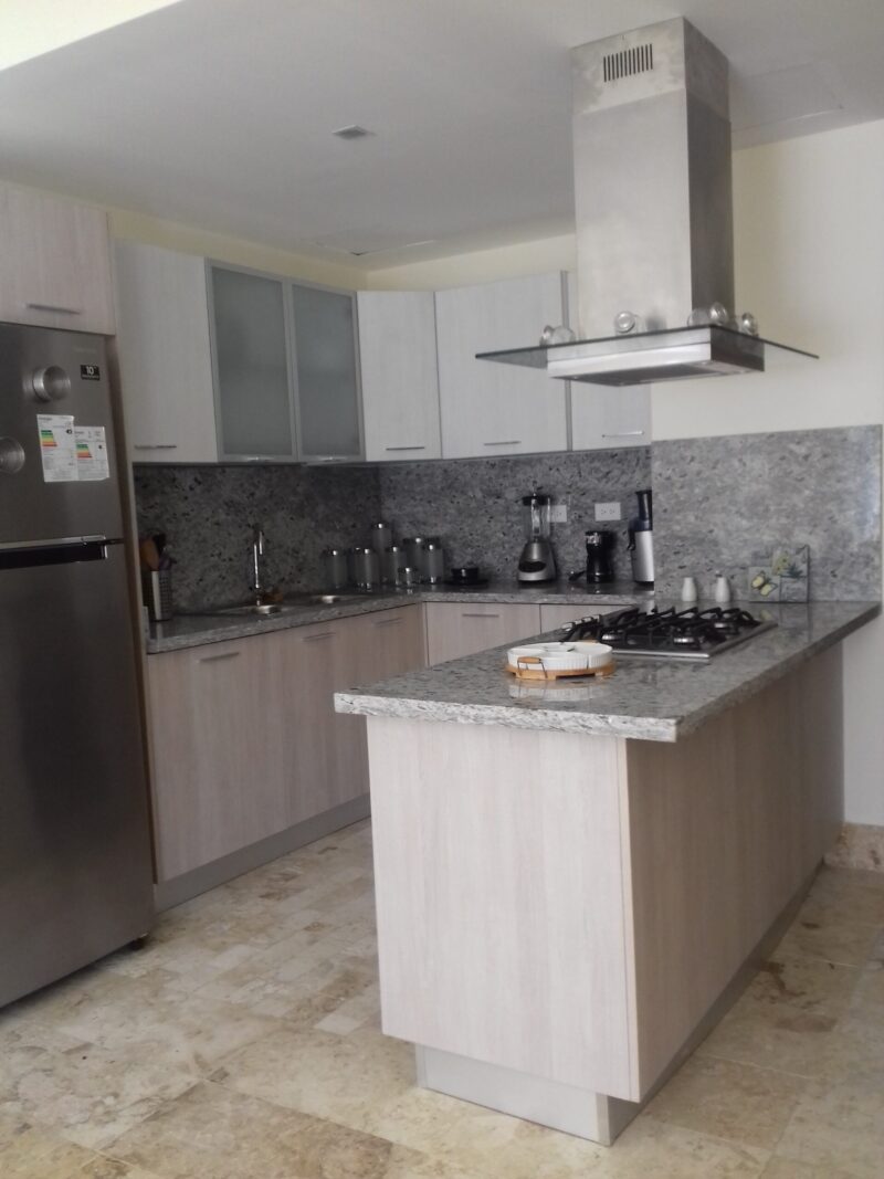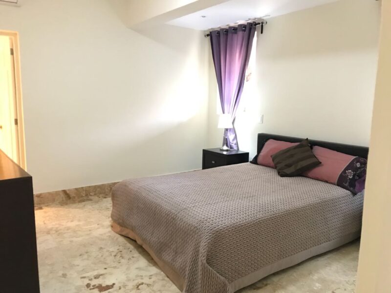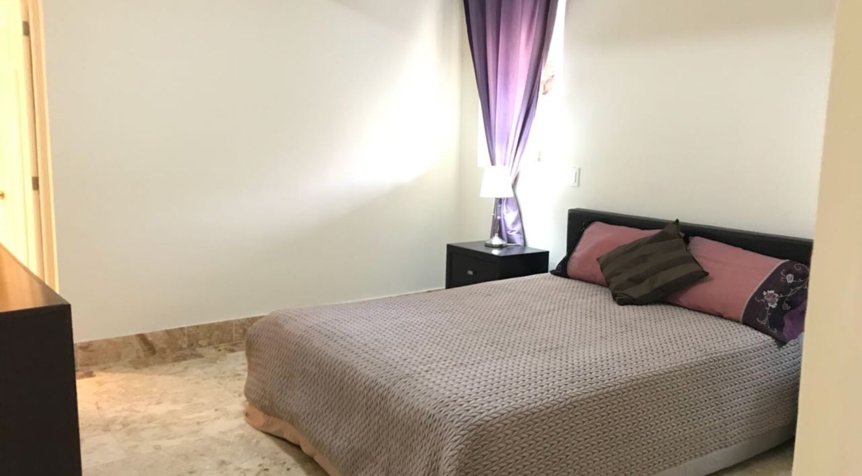 Apartamento en primer nivel, ubicado dentro de resort con 2 habitaciones, 2 baños, sala – cocina, terraza con vista a piscina.