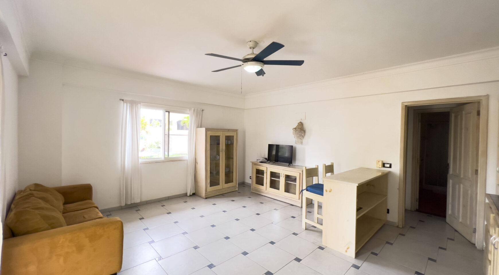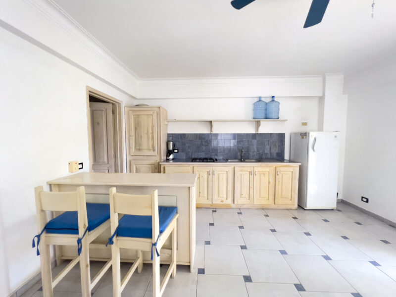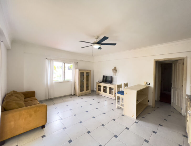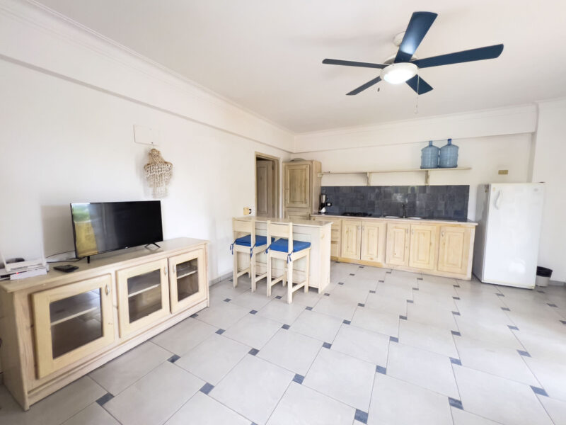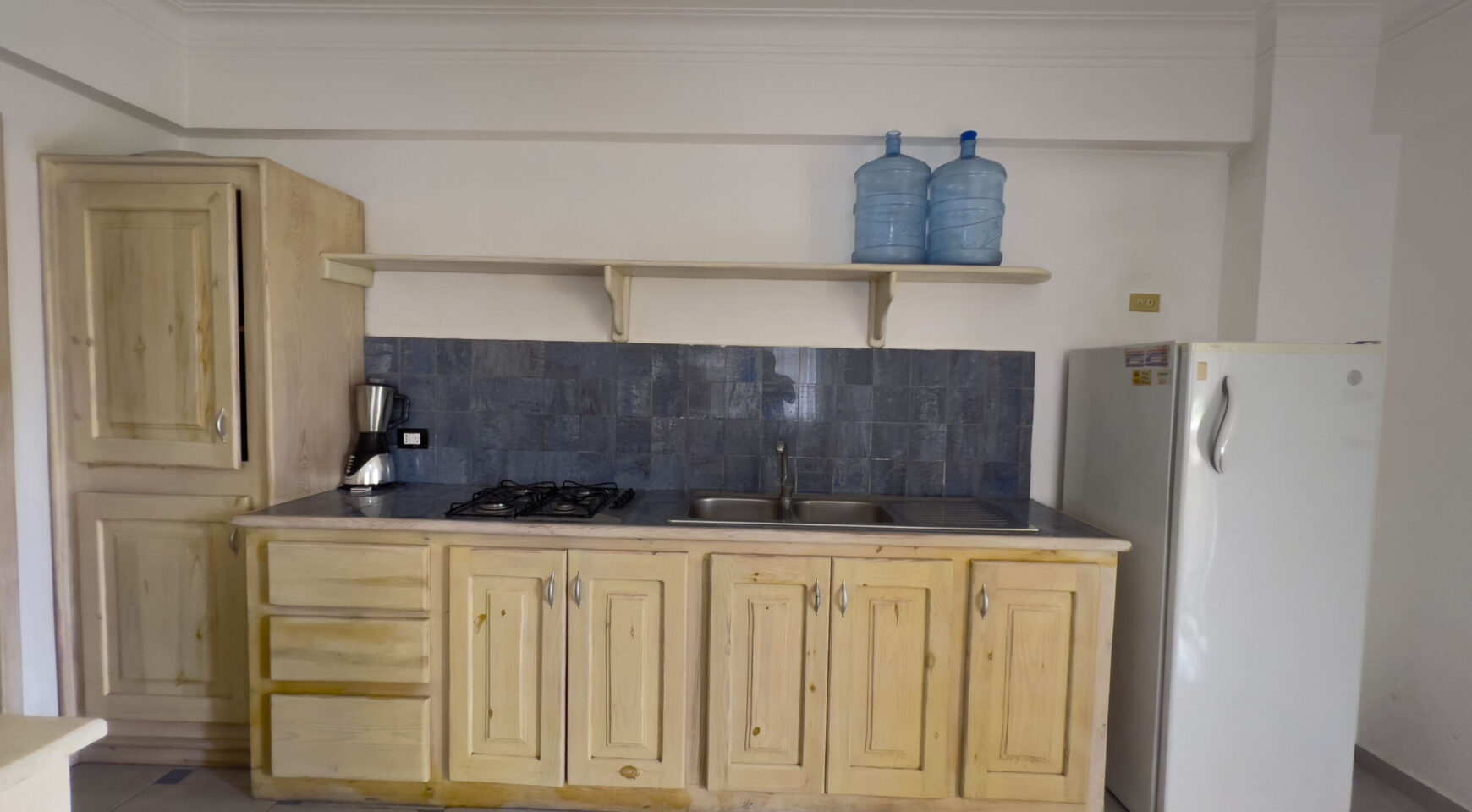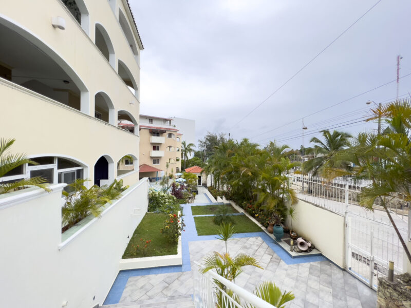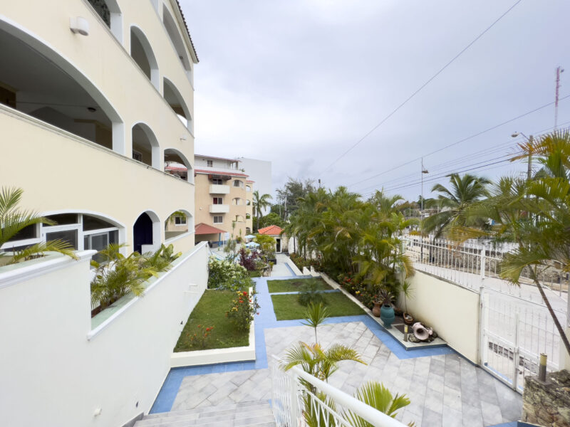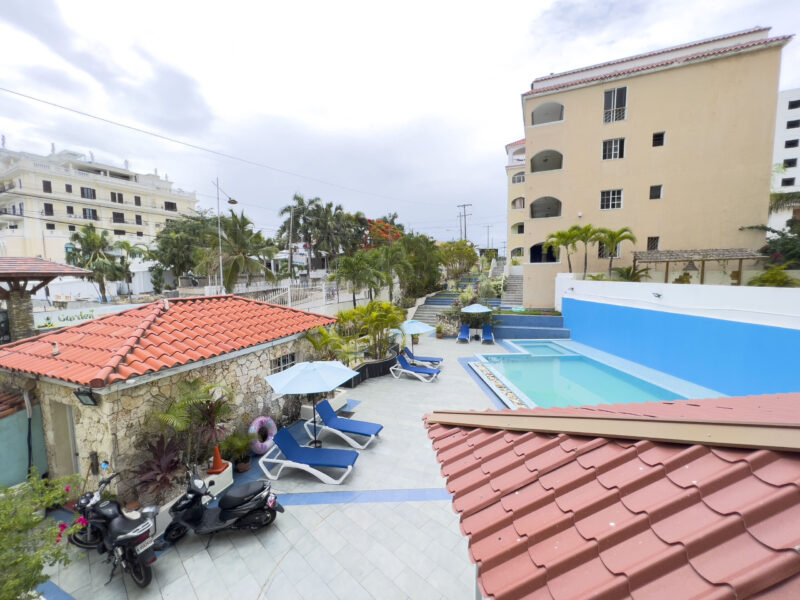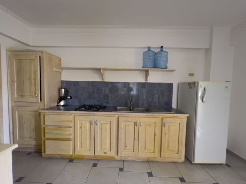 Apartamento cerca de playa,   segundo nivel, 1 habitación, 1 baño, sala – cocina, balcón con vista calle y piscina.