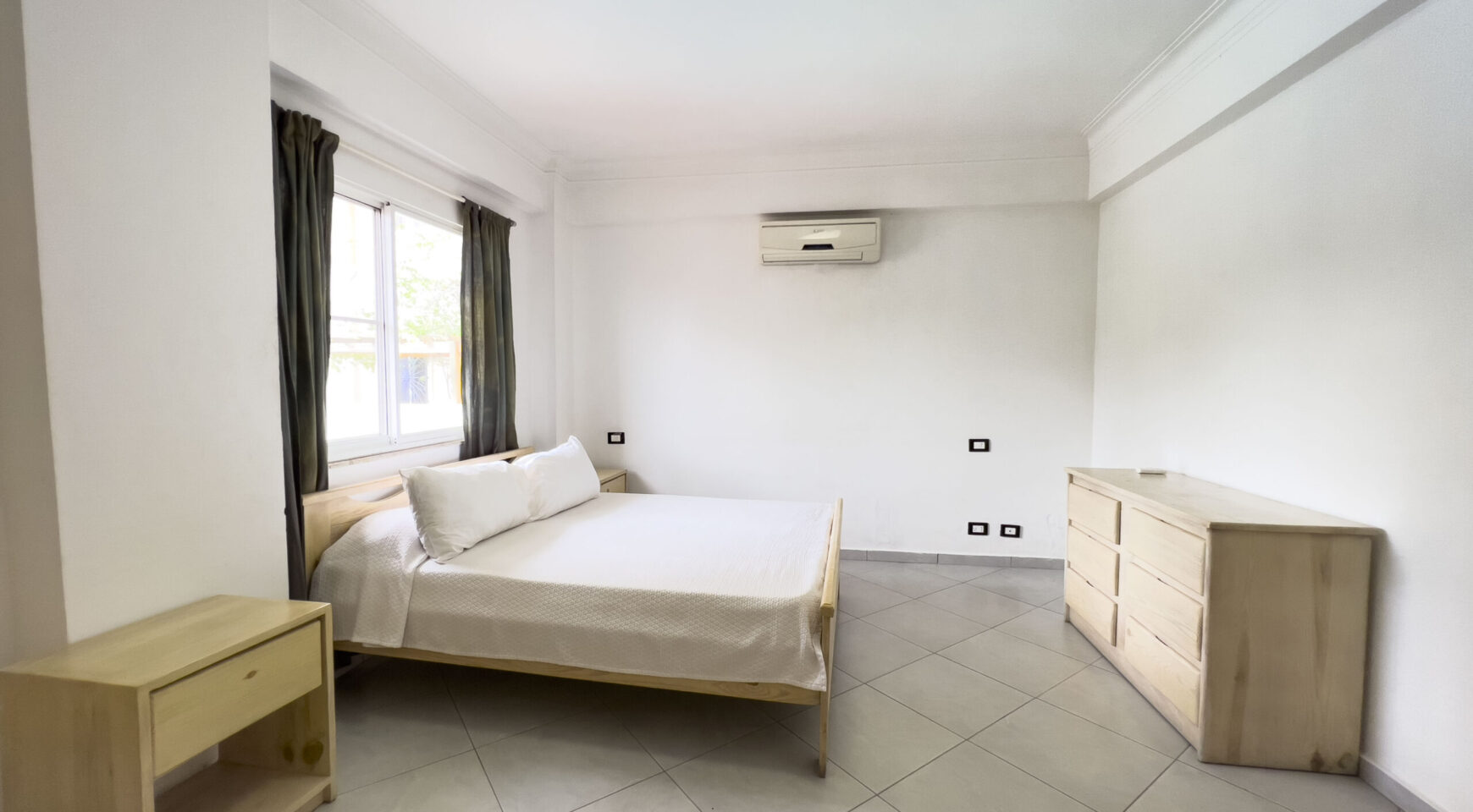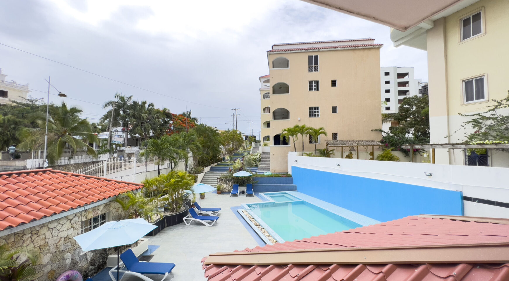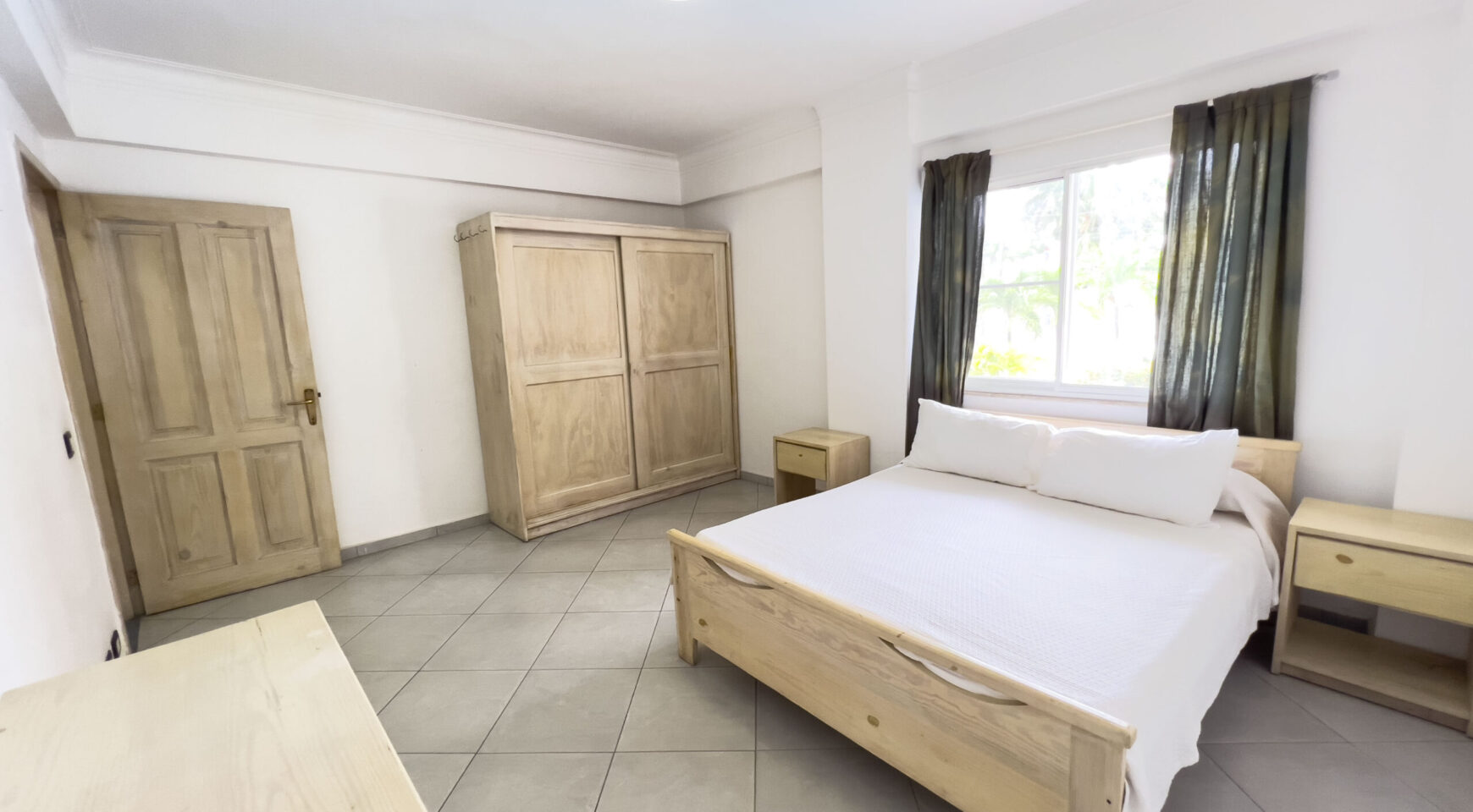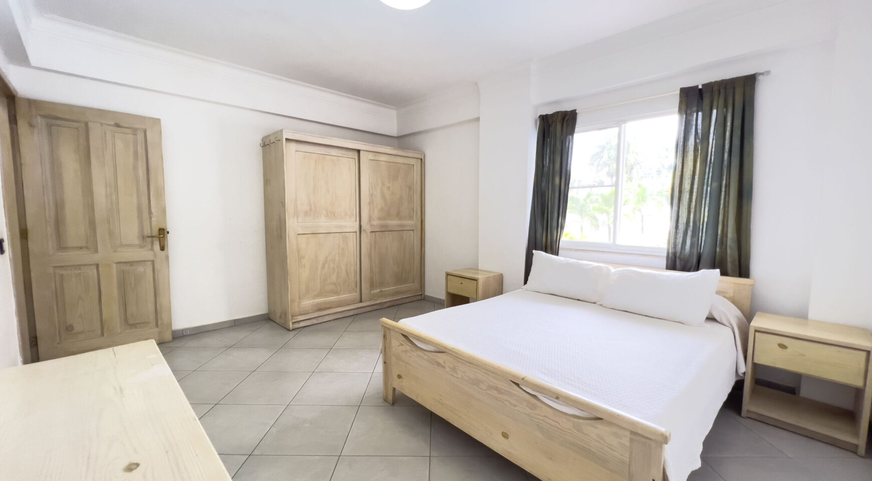 Apartamento cerca de playa,   segundo nivel, 1 habitación, 1 baño, sala – cocina, balcón con vista calle y piscina.