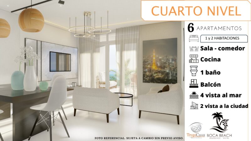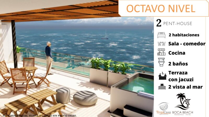 Elige entre apartamentos de 1 habitación, sala – comedor y terraza o penthouses de 2 habitaciones y 2 baños con terraza y jacuzzi incluidos.